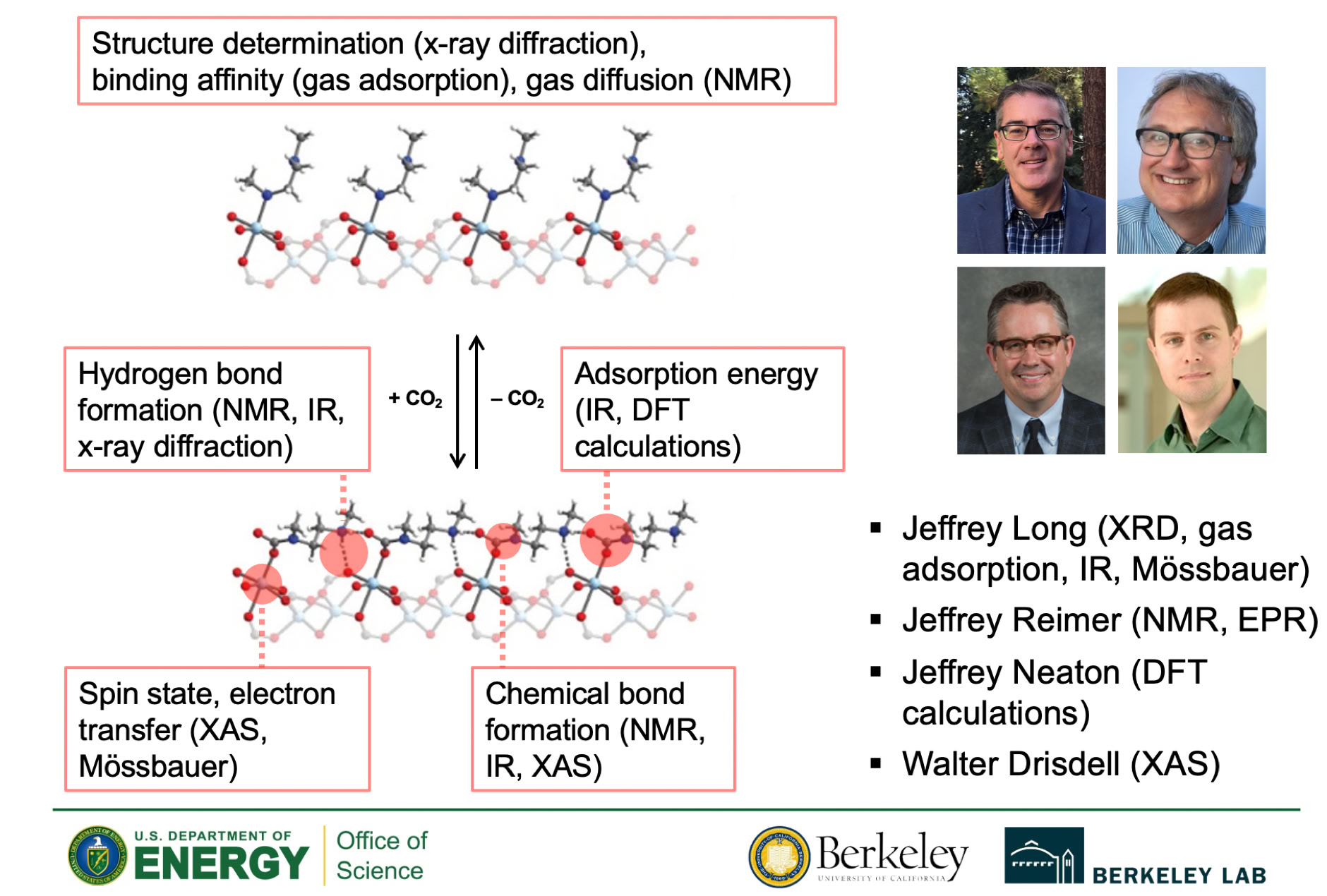 Together with the groups of UCB Profs. Jeff Long, Jeff Neaton, as well as Dr. Walter Drisdell at LBNL, we develop and employin-situ spectroscopic and diffraction methods to investigate how MOFs with coordinately unsaturated metal sites adsorb target gas molecules with high affinity and selectivity.